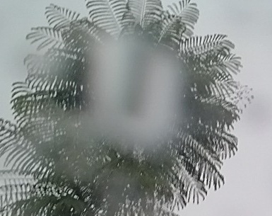 I tried to take a pic through the window(attached) but the rain drops were covering the entire window, the car was moving and I could not record the beauty of the moment. (in the center of the photo – the rain drop through the light of lightening). Heavy rain, dark sky, lightening, and the palm-tree mandalas…”